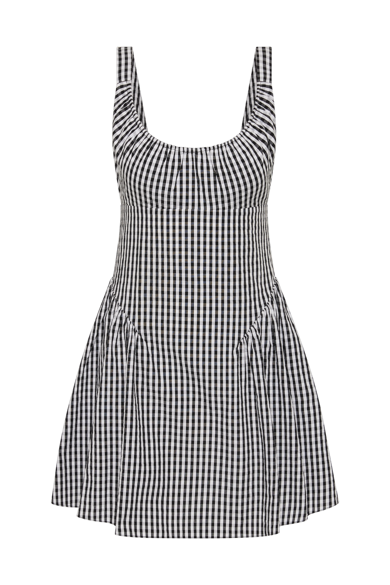 Detail: A vintage-inspired mini dress, designed from a signature 100% cotton, yarn-dyed in a nostalgic black and white gingham. Fitted through the bodice with a scoop neckline and gathered bust, it features a drop waist silhouette with further gathering at the sides. From there it falls into a soft A-line skirt, cropping short on the body. With effortless throw-on throw-off appeal, style with a simple sandal for long summer days.