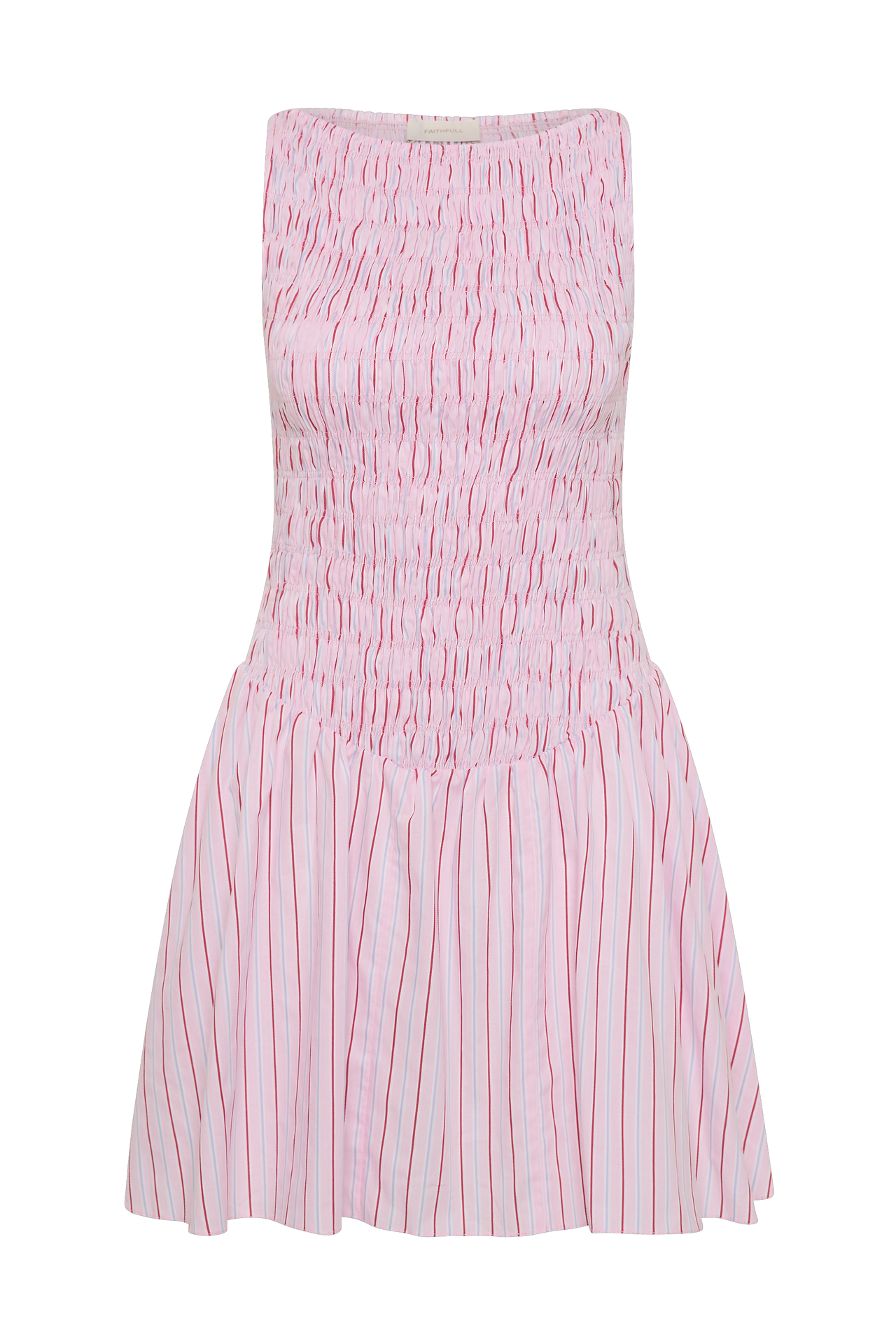 Detail: An everyday mini dress, designed from a signature 100% cotton, yarn-dyed in a nostalgic pink and red pinstripe. Sleeveless with a boat-style neckline, the bodice is shirred with a curved, gathered waist. It then falls into a soft A-line skirt that crops short on the body. With lightweight throw-on throw-off appeal, pack for your next summer vacation.