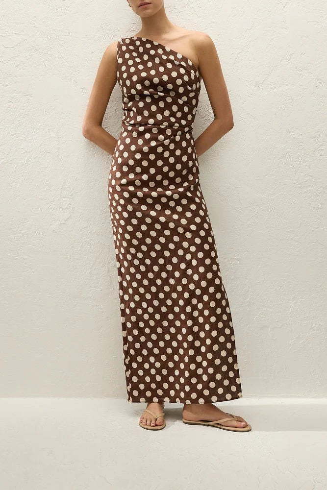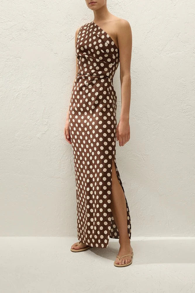 Detail: A timeless silhouette, this one-shoulder maxi dress is designed from a signature 100% European Flax® linen in a vintage-inspired chocolate polka dot print. Intended for effortless ease between day and night occasions.