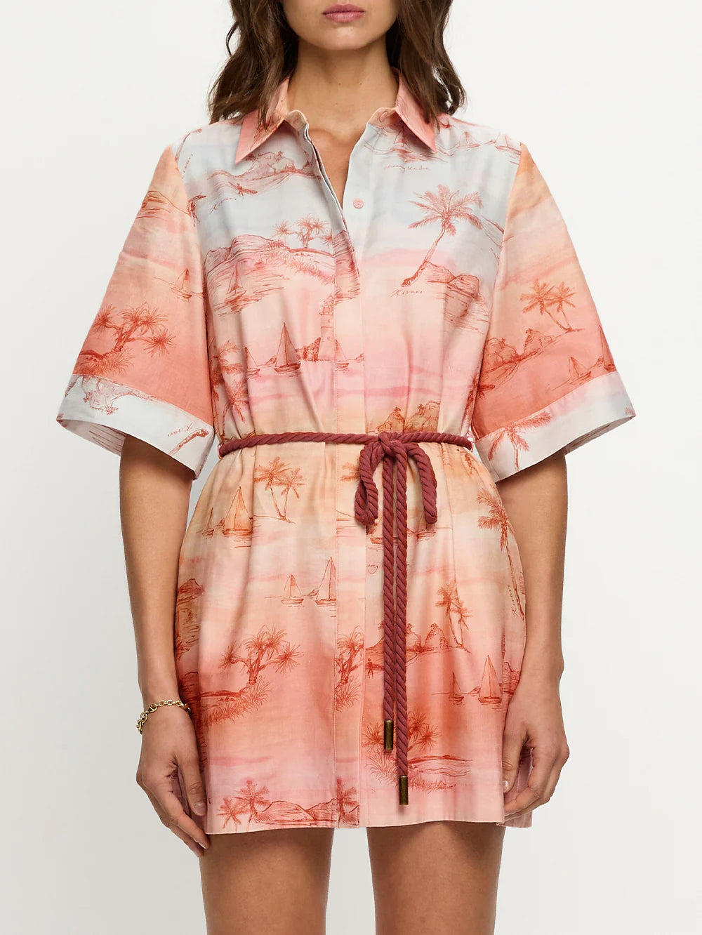 Detail: Sunset is a soft ombré wash of blush and sand tones with delicate coastal scenes - palm trees, sailboats and shoreline motifs - evoking a sun-faded, vintage seaside story. The Sunset Mini Dress is a relaxed silhouette featuring kimono-style sleeves, a classic collar and a button-through front, complete with a removable waist tie for versatile styling. Style with sandals for sun-soaked weekends and long lunches.