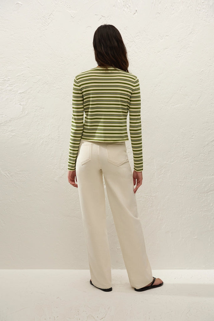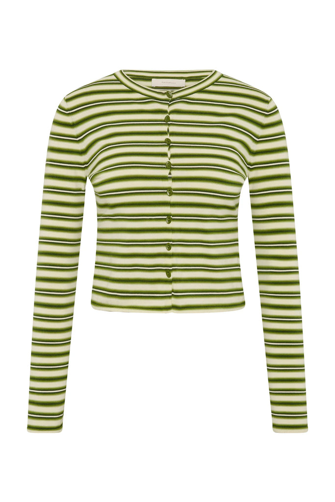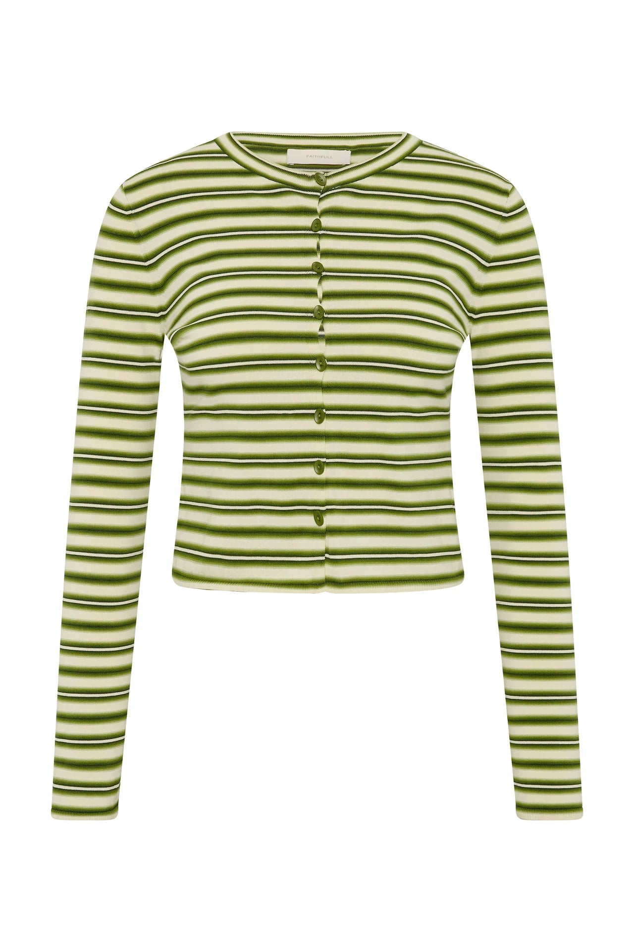 Detail: A retro-inspired cardigan, designed from a unique blend of cotton and viscose in a vibrant green stripe. A fitted silhouette, it features a high rounded neckline with one simple button closure at the front for versatility in styling. The sleeves are long and also fitted through the arms. Intended to style with our matching Esenia Knit Dress with lightweight, effortless appeal. Wear between the beach and bar!