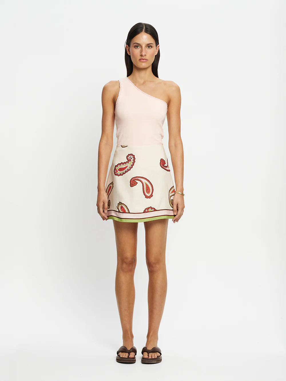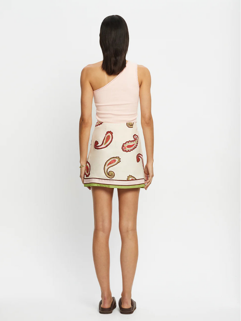 Detail: Eden is a vibrant paisley print featuring intricate motifs in red, pink, and green tones set against a light neutral base. The Eden Mini Skirt is an A-line skirt shape framed with a lime green band with contrast stripe across the hem. Style with the matching Eden Shirt for a coordinated look, or pair with our signature tallulah tank and sandals for weekend outings.