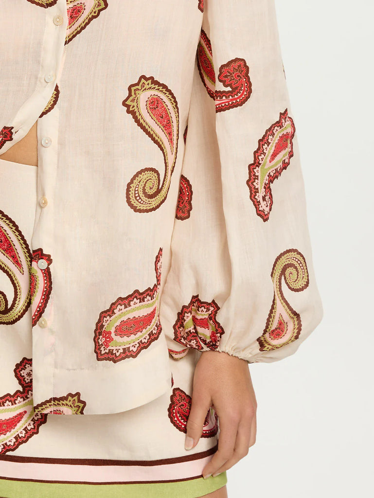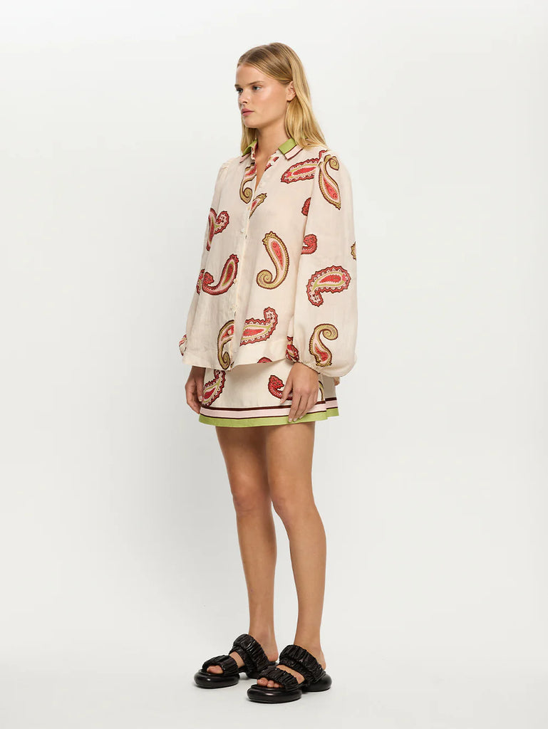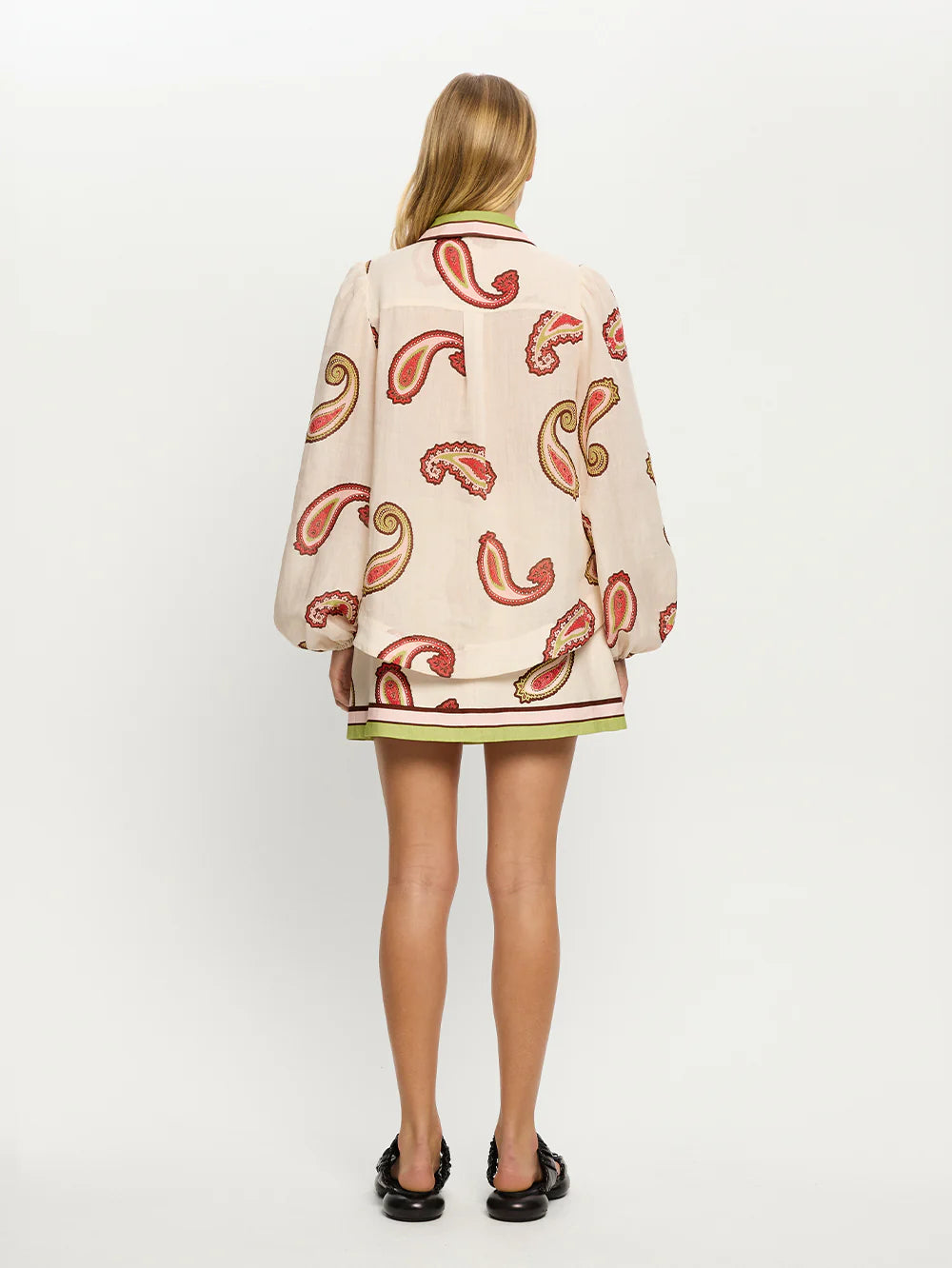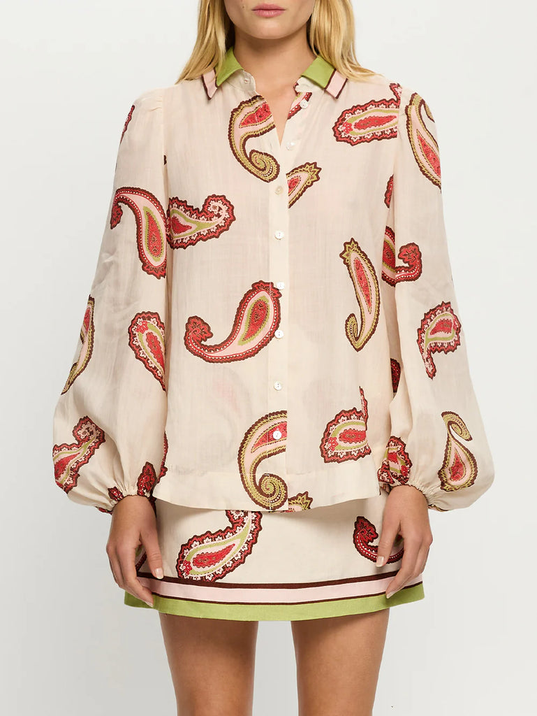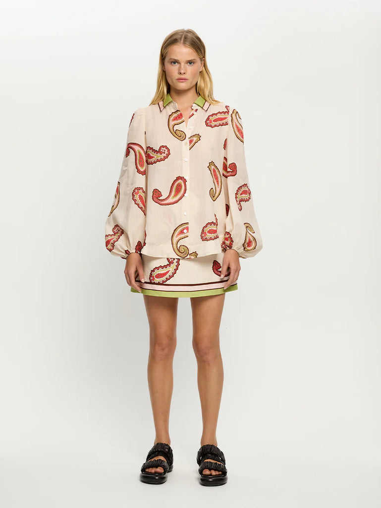 Detail: Eden is a vibrant paisley print featuring intricate motifs in red, pink, and green tones set against a light neutral base. The Eden Shirt is a relaxed silhouette featuring blouson sleeves and a button-through front, framed with a lime green band with contrast stripe at the collar. Style with the matching Eden Mini Skirt for a coordinated look, or pair with denim for a more refined look.