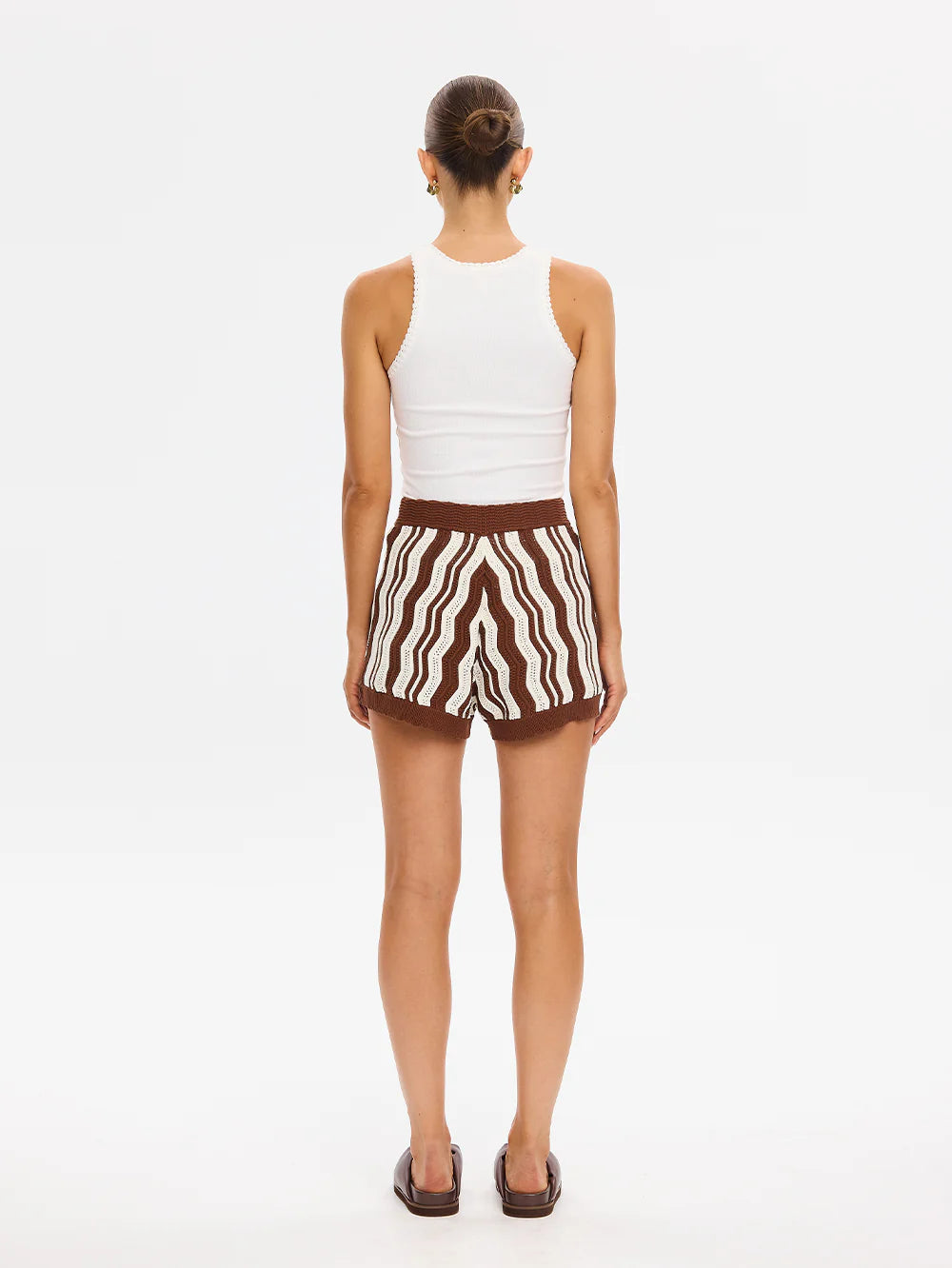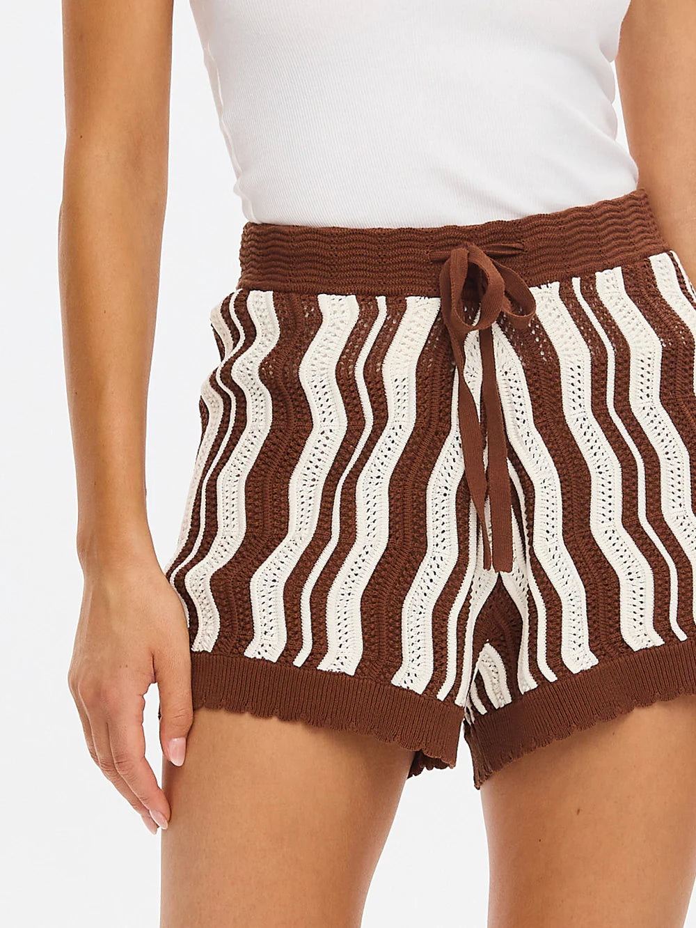 - Pointelle wave stripe knit design in chocolate and cream