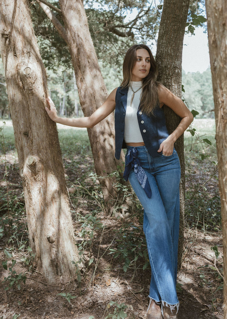 Detail: The column wide straight-leg is the essential jean for your closet! Cut from a comfort stretch denim that is blended with the perfect amount of stretch for a comfortable fit. Designed to sit high on the waist, full length inseam and raw hem detail. The classic rinse dark indigo wash makes them endlessly versatile. Made in Mexico