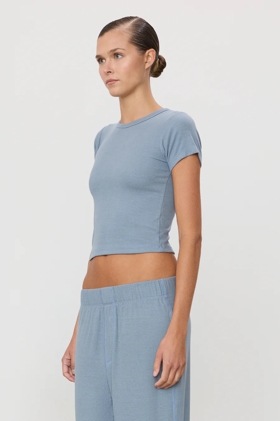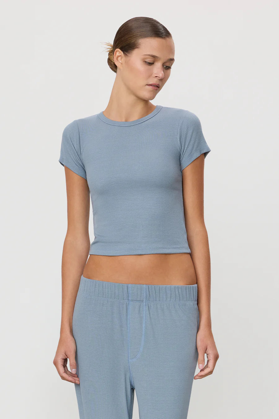 Details: ÉTERNE's Short Sleeve Baby Tee is crafted from our butter-soft ribbed fabric, offering a slim fit and cropped length—a versatile essential for everyday wear.