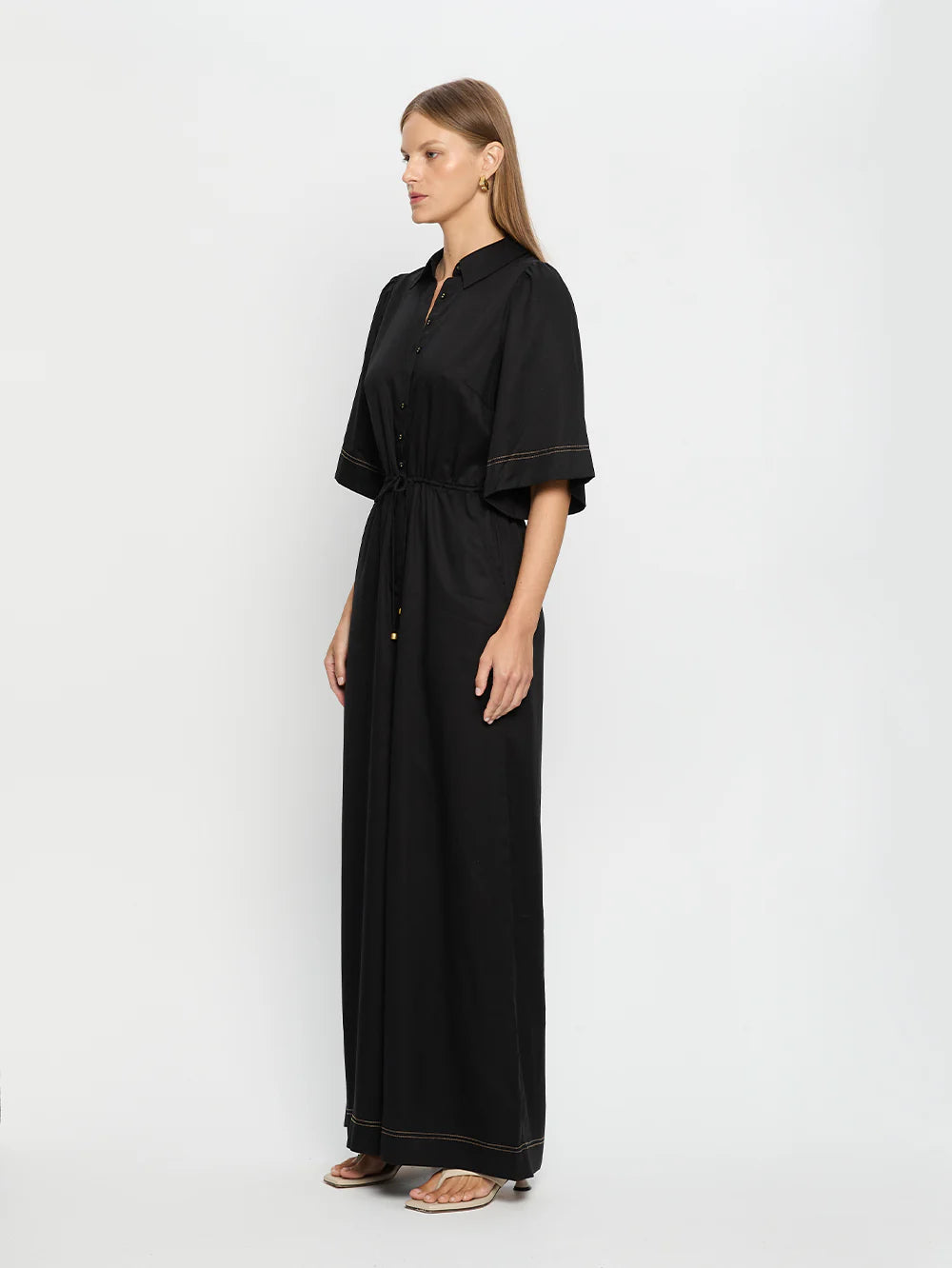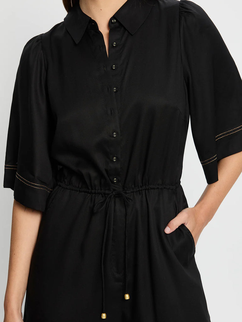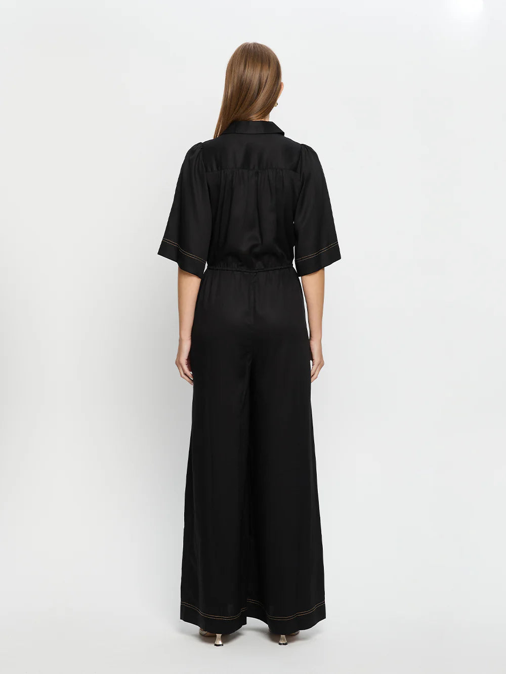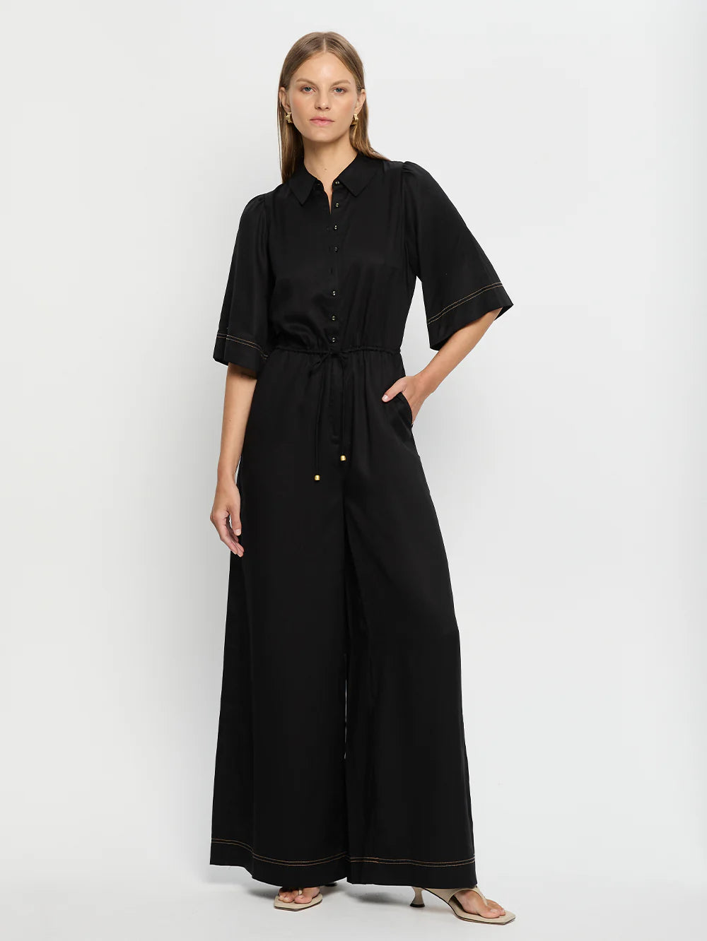 Detail: The Astoria Jumpsuit in black features a button through front bodice, adjustable drawcord at waist, relaxed wide leg complete with contrast stitching at hem and cuffs.